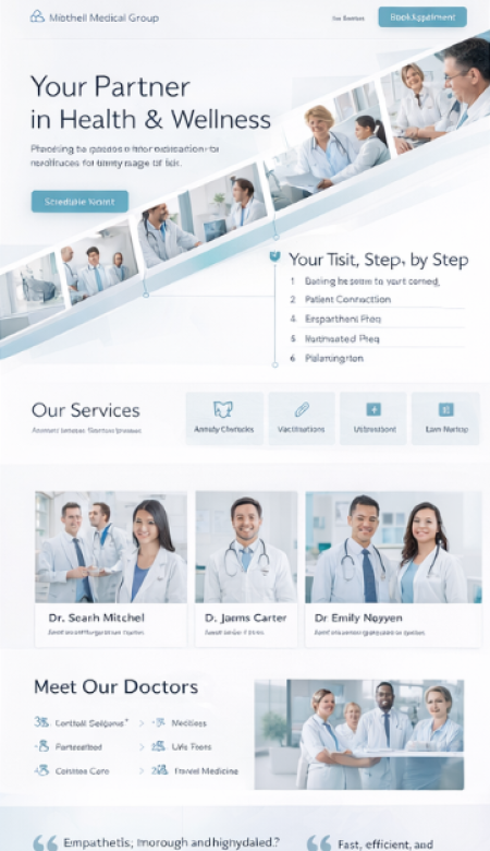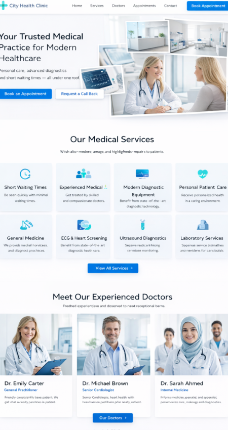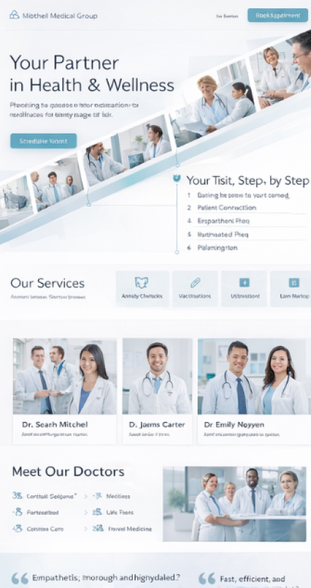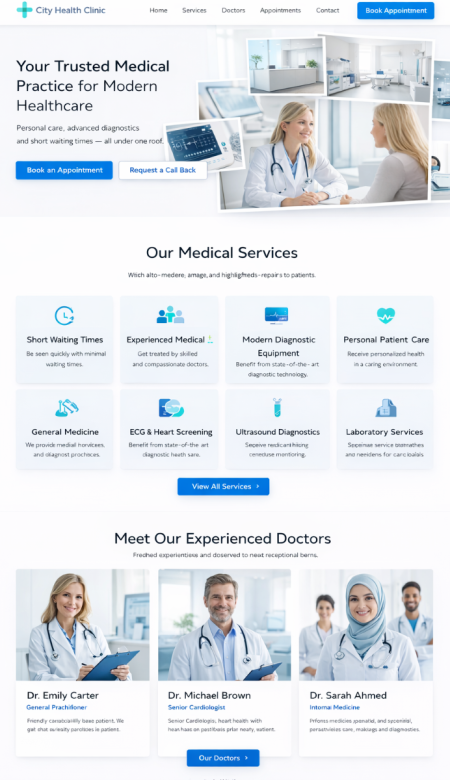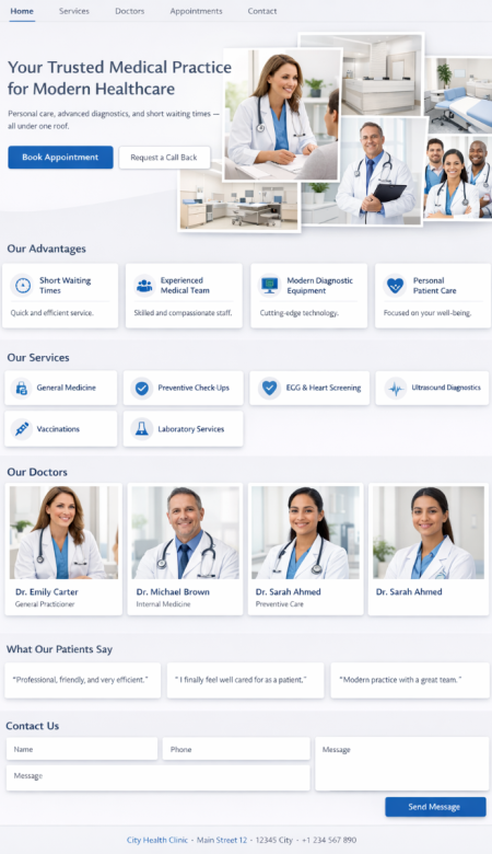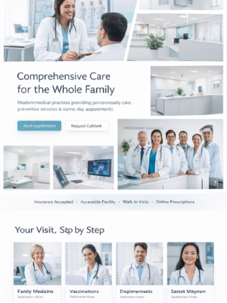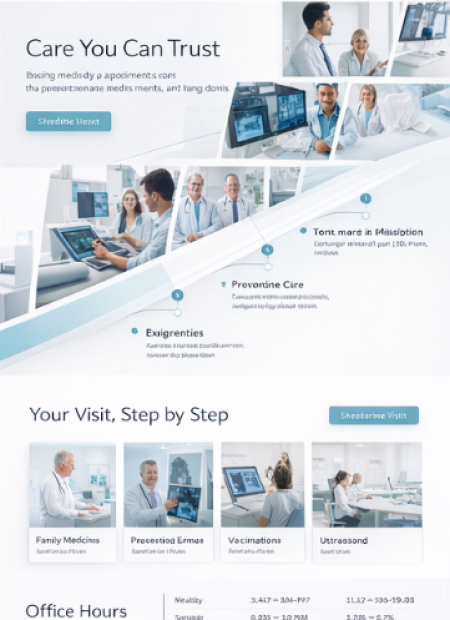 Present your practice professionally: specialties, services, team, locations, office hours, and contact methods. Include online appointments, forms for new patients, and clear information about procedures. Optionally with a news section, multilingual support, protected patient areas, and document pages (e.g., information sheets, instructions, downloads).