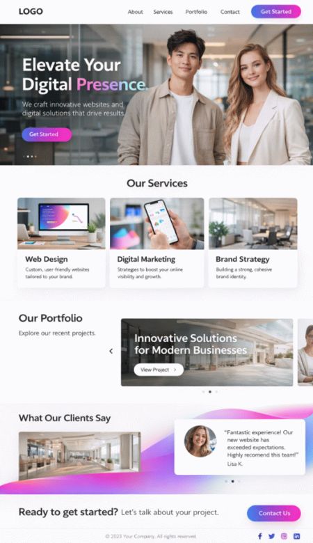 Clear offer page, references, benefits, price, and call-to-action. Optional with lead magnet and email follow-up.